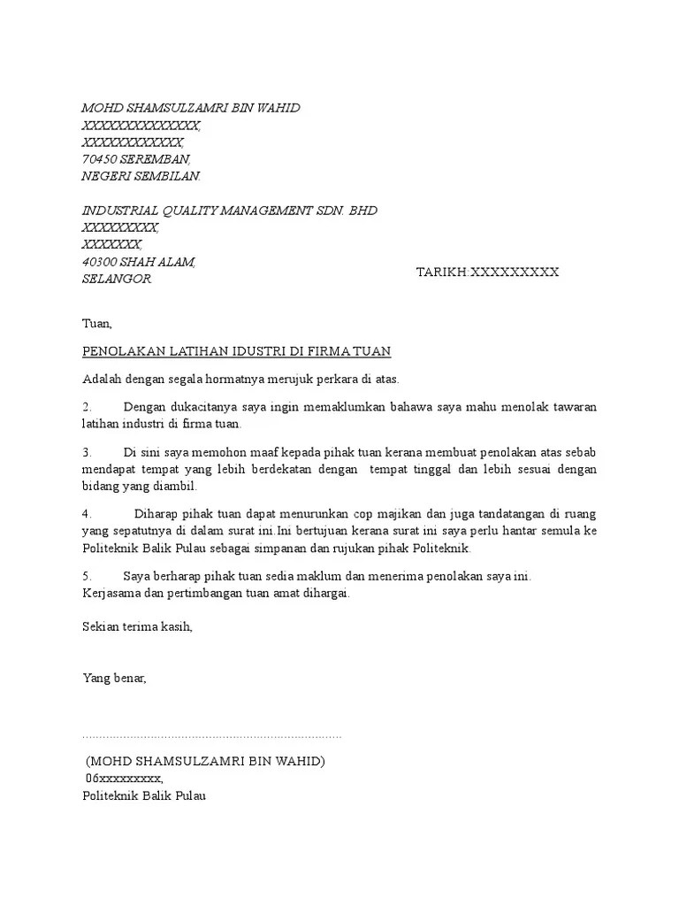 Tuan/puan, penolakan tawaran menjalani latihan industri merujuk kepada surat tuan/puan yang bertarikh .